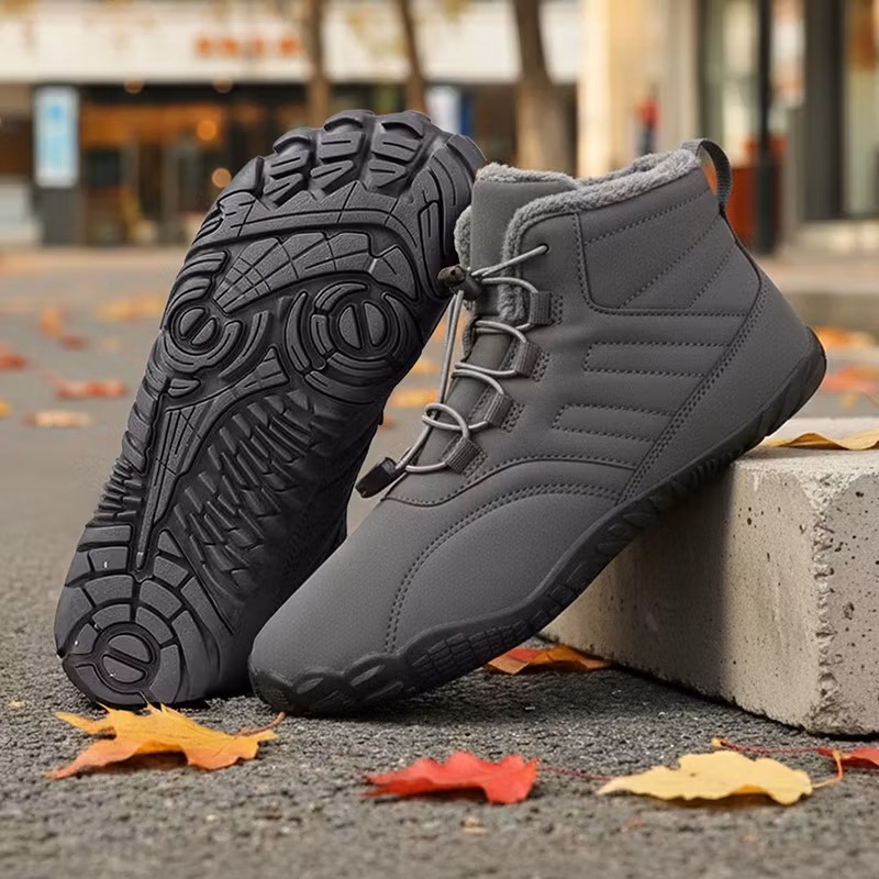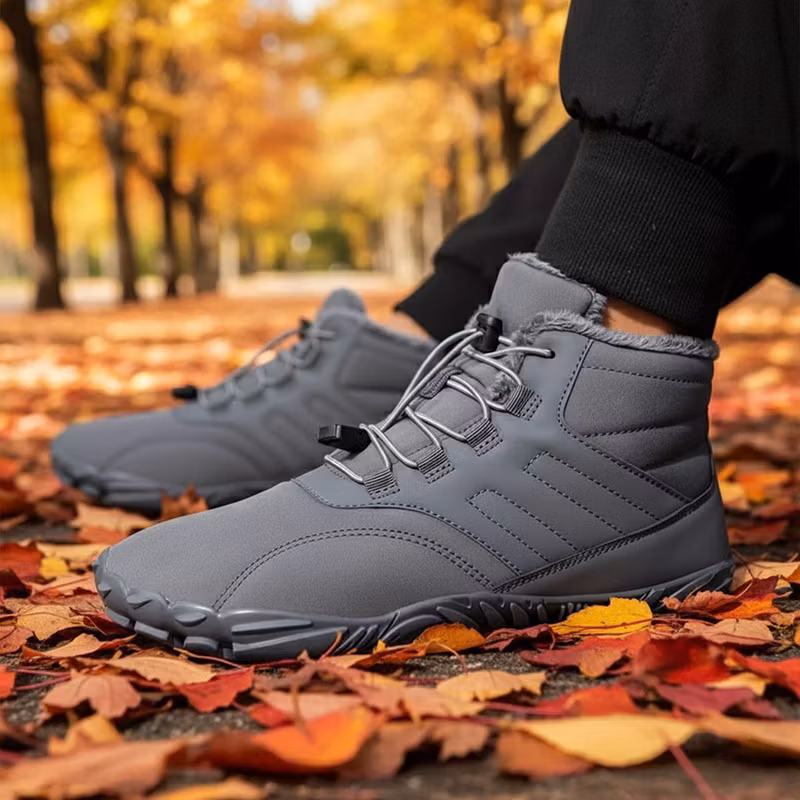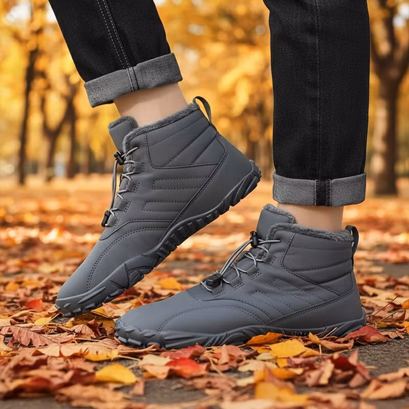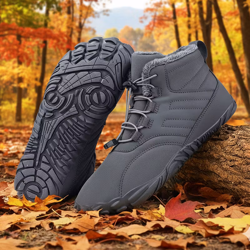 Disse grå barfotskoene gir deg friheten til å gå, vandre eller trene med din naturlige fotnedsetting samtidig som de holder føttene dine varme og tørre gjennom høsten og vinteren.