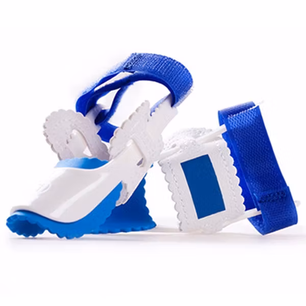 To korrigerende støtter for hallux valgus. Støttene skal brukes om natten for å rette leddene i stortåen. Støtten stabiliserer de viktigste leddene.