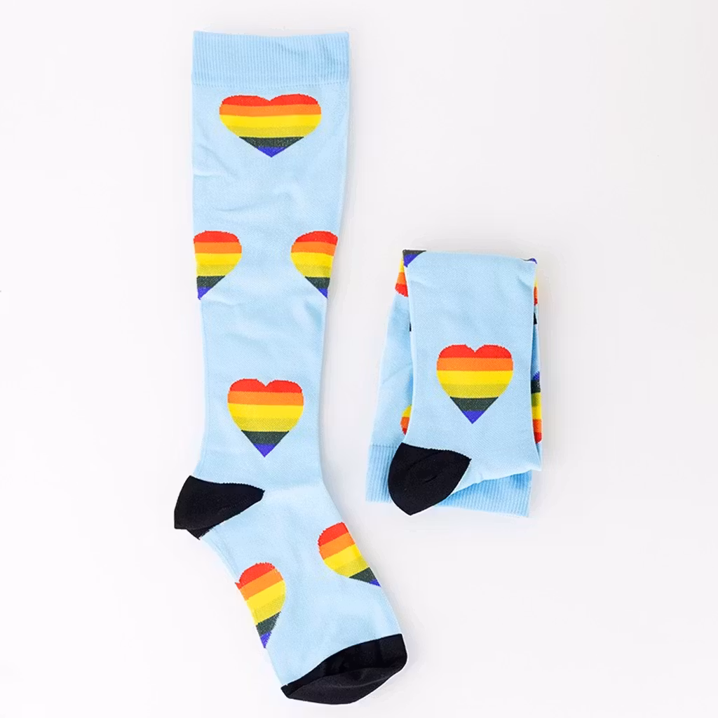 Ett par ljusblåa härliga stödstrumpor i ett färgglatt mönster med symboler av hjärtan. Stödstrumpor ger kompression för benen vilket gör att blodcirkulationen ökar. Det gör i sin tur att svullnader och trötthet i benen minskar. Stödstrumpor fungerar som ett utmärkt hjälpmedel för dig som belastar benen mycket under dagarna.