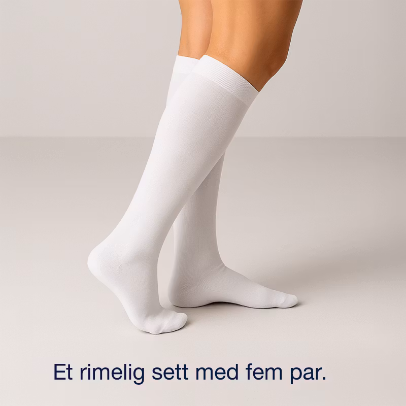 En pakke med fem par populære støttestrømper som lindrer tretthet i beina, øker blodsirkulasjonen og reduserer risikoen for blodpropper. Støttestrømpene fungerer som et utmerket hjelpemiddel for de som belaster beina mye på jobben eller i fritiden.