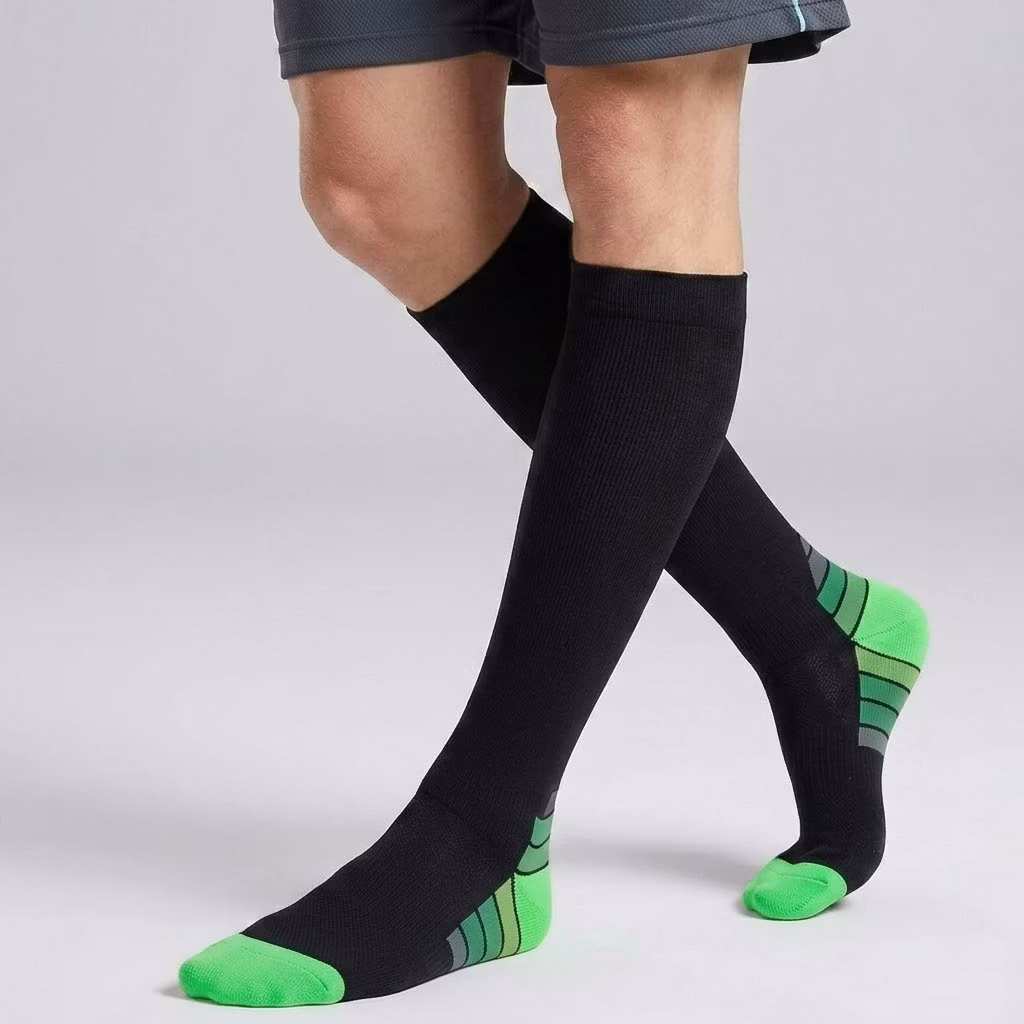 Et par grønne støttestrømper som hjelper deg å øke blodsirkulasjonen i føttene og beina. Støttestrømpene forebygger åreknuter, reduserer risikoen for skader når du trener og bidrar til å holde sirkulasjonen oppe under for eksempel flyturer.