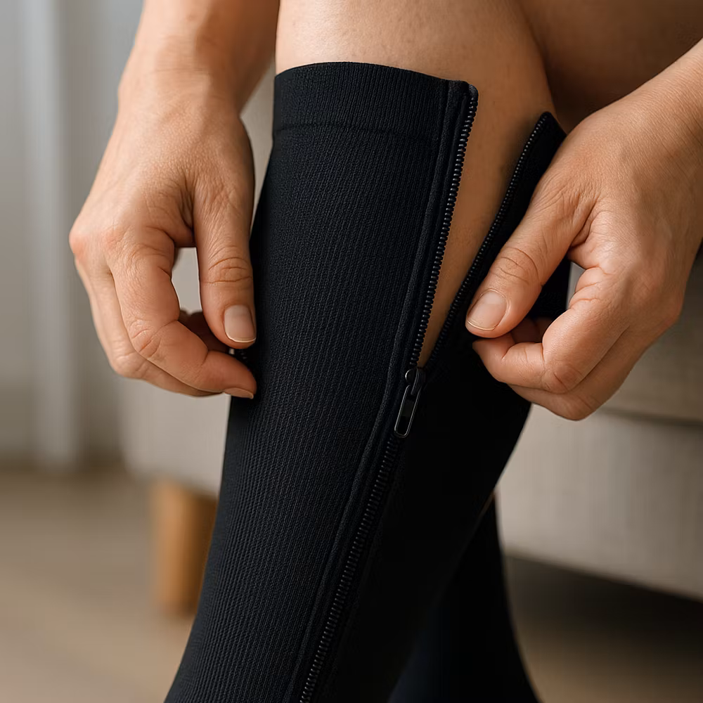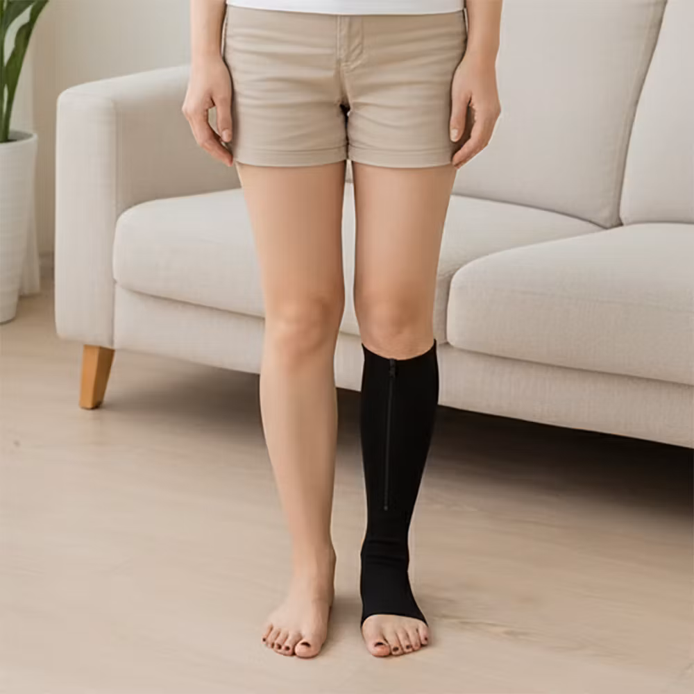 Den smarte glidelåsen på siden av strømpene gjør at du enkelt kan ta dem på deg, uten å måtte slite som med vanlige trange og tunge støttestrømper. Denne modellen er også tilgjengelig i beige her.