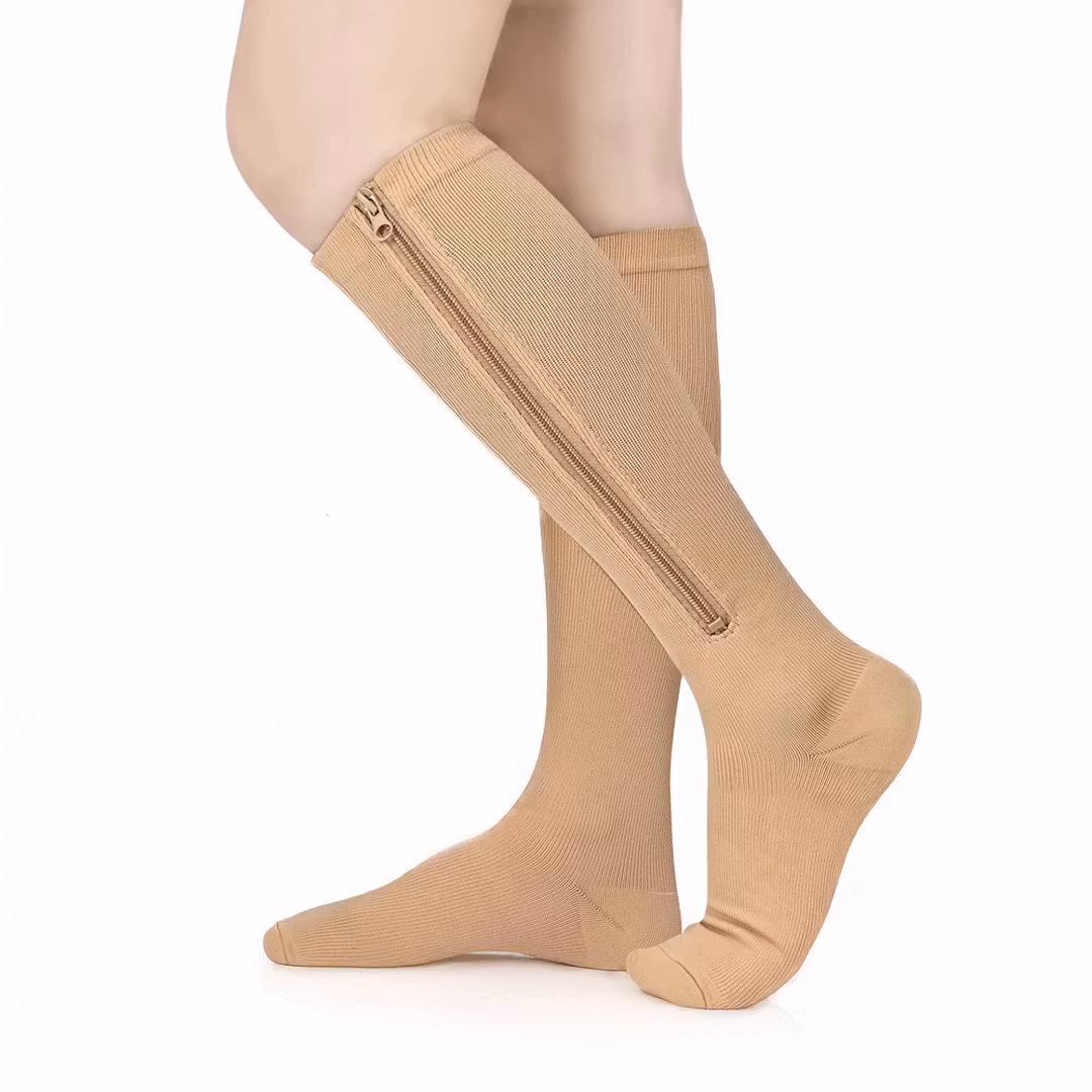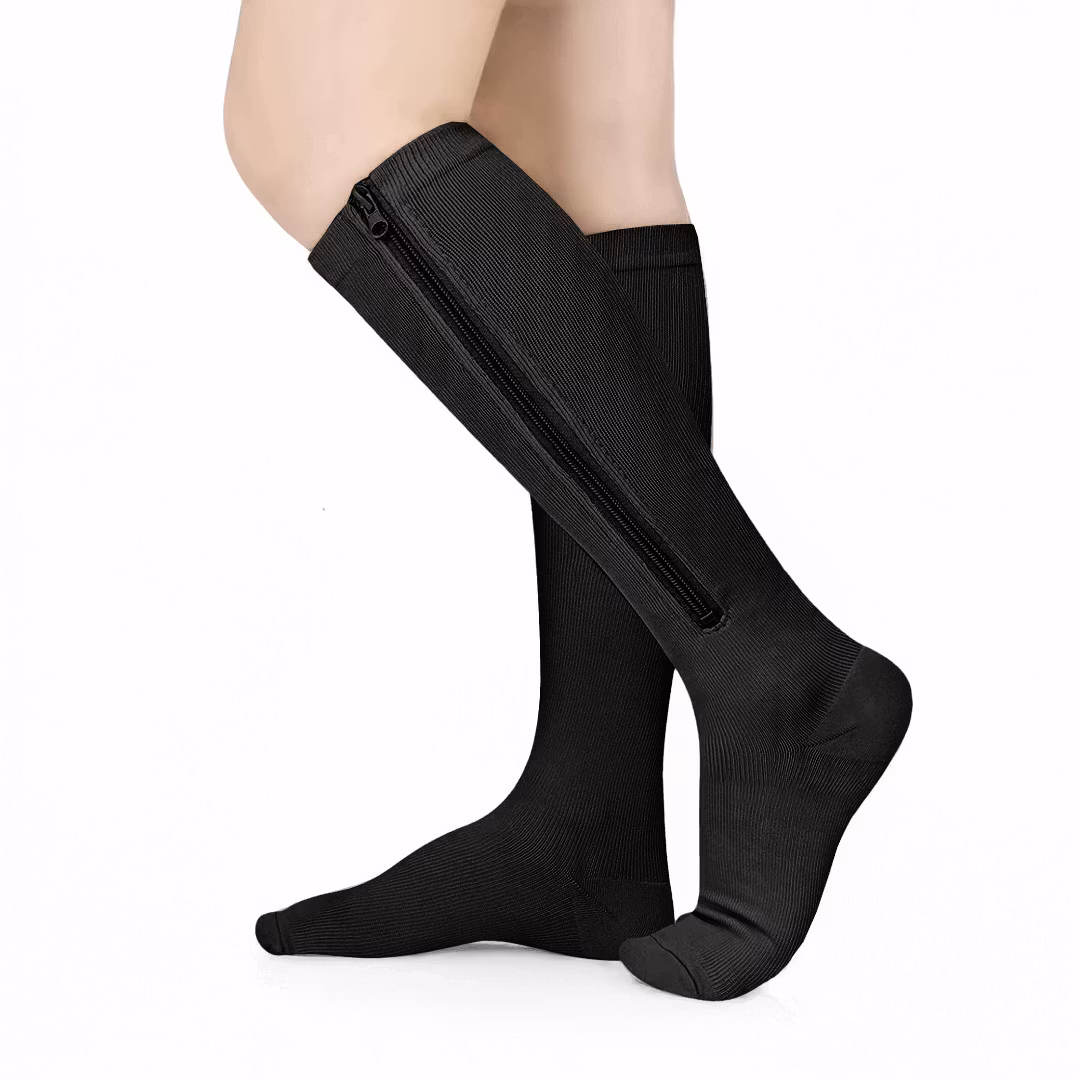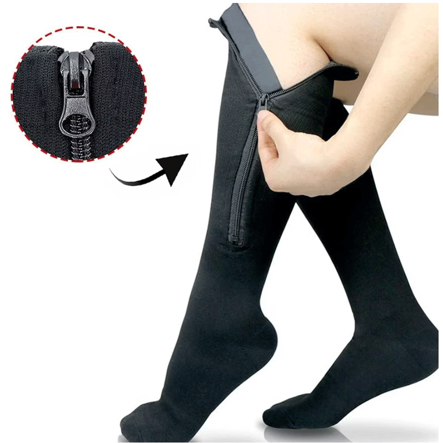Liker du støttestrømper, men vil unngå bryet med å ta på og av altfor stramme strømper? Da er disse støttestrømpene med glidelås den perfekte løsningen for deg.