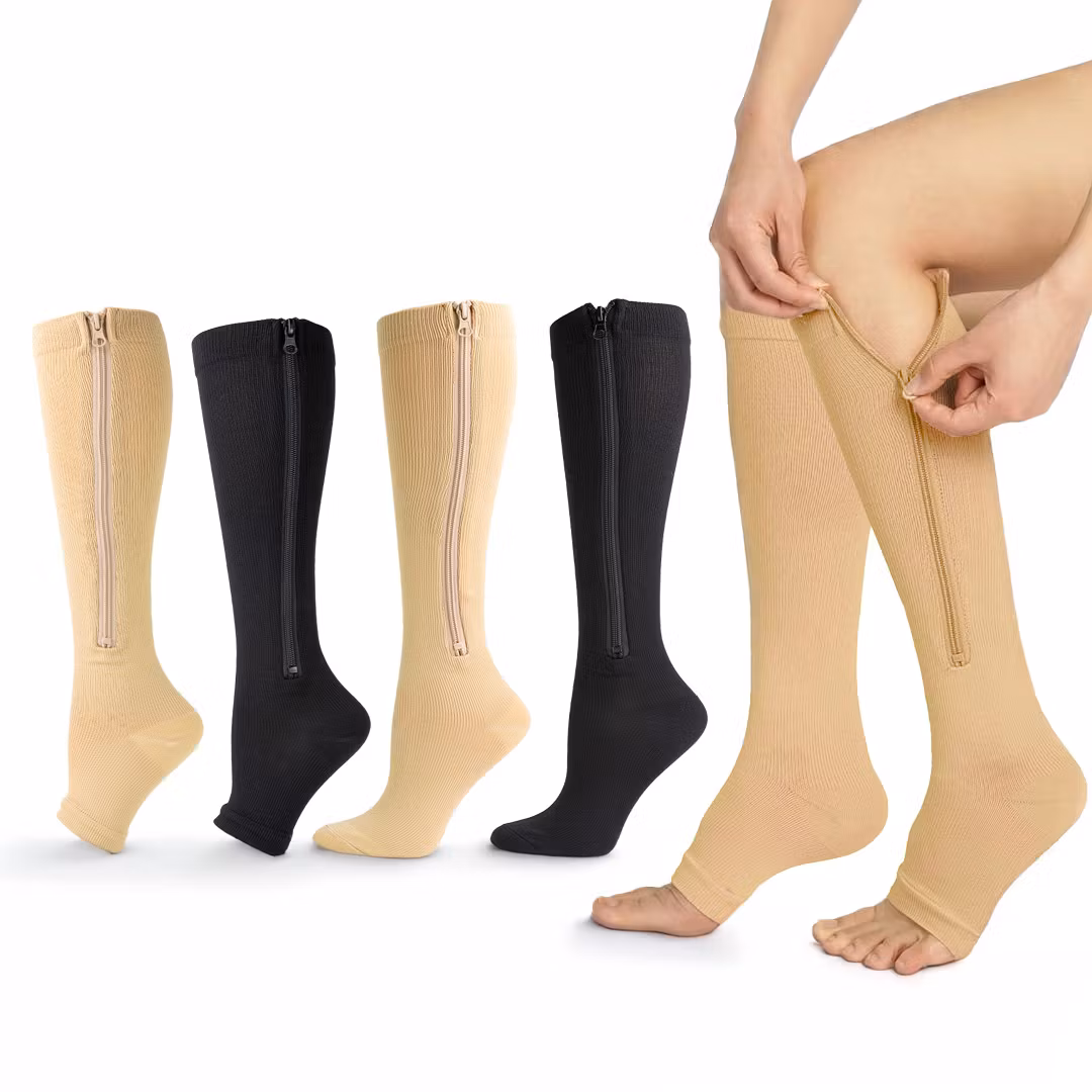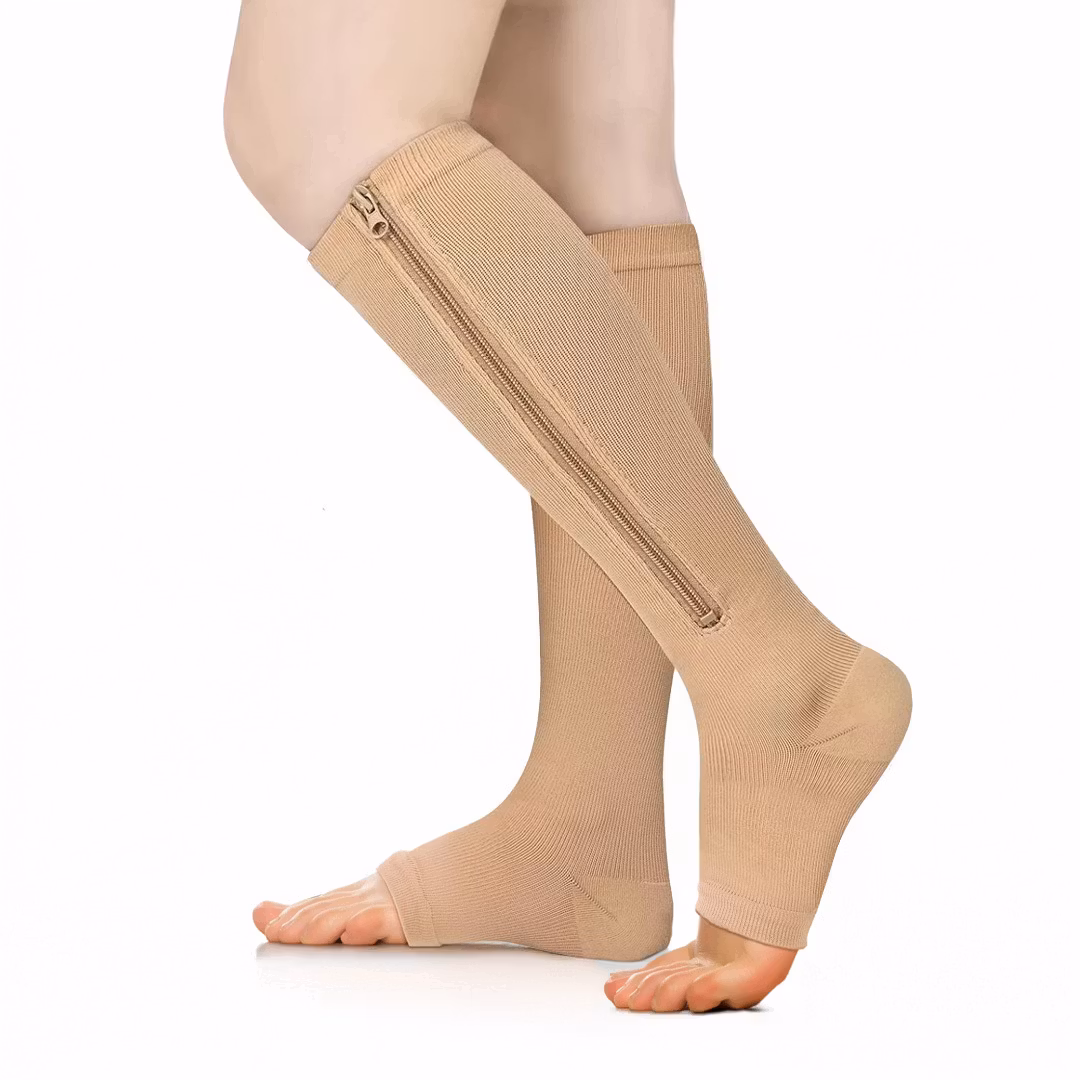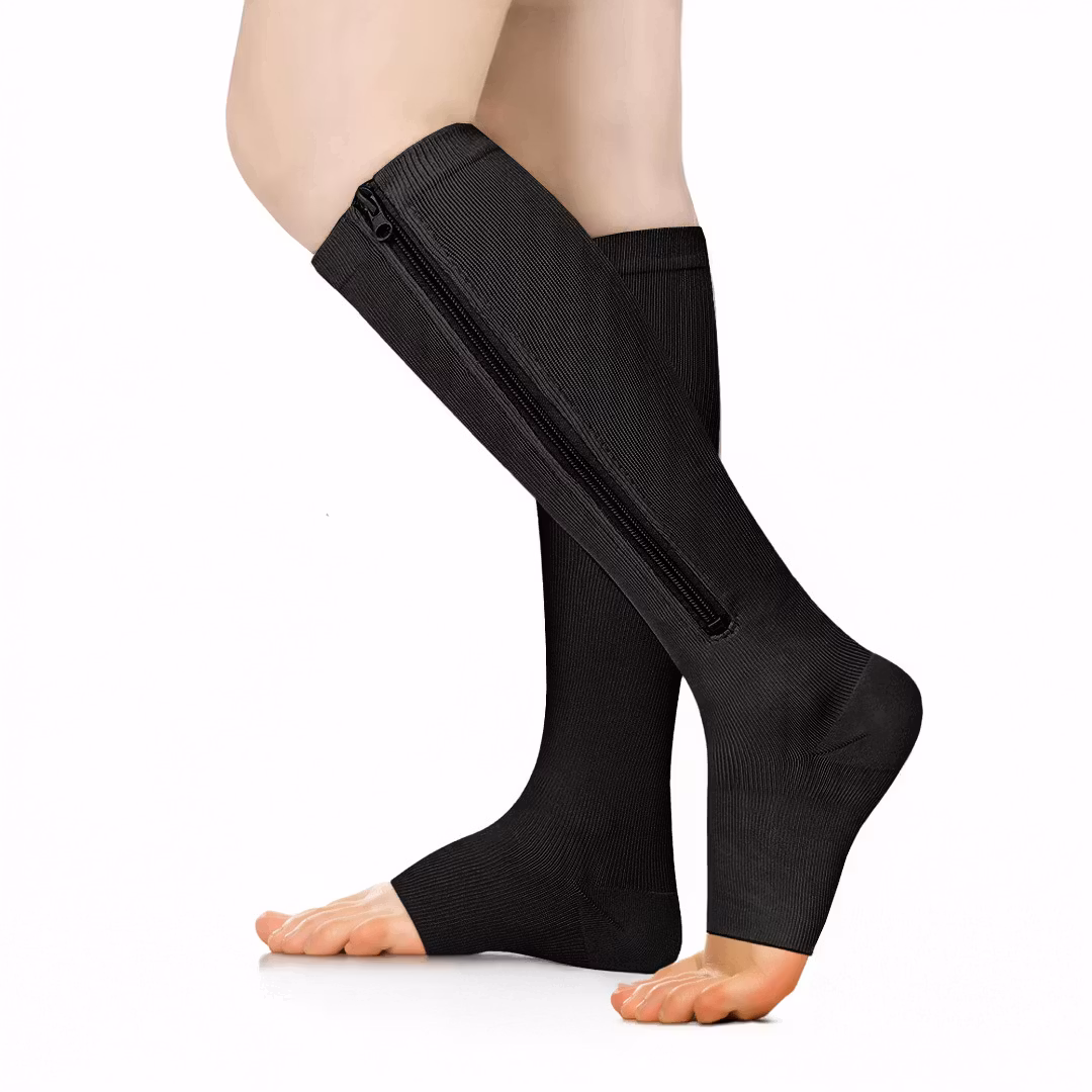 Liker du støttestrømper, men vil unngå bryet med å ta på og av altfor stramme strømper? Da er disse støttestrømpene med glidelås den perfekte løsningen for deg.