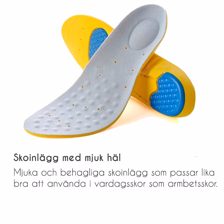 Et par myke innleggssåler med ekstra løft for hælene. Innleggene fungerer utmerket i både arbeidssko og hverdagssko.