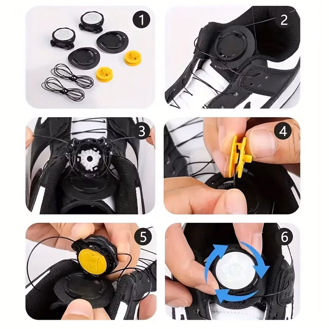 Montera snörlåset enligt medföljande instruktioner. Trä snörena genom öglorna och fäst dem i spänningsmekanismen. Vrid för att spänna – lyft ratten för att lossa. Snabbt och smidigt varje gång du tar av eller på skorna.